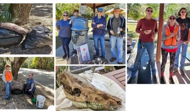 Nine people came out to pick up trash along Old Dixie Highway in the Ormond Tomb Park area. A big thank you to Ken Battan, Alicia Oktar, Sonya Lehto and her son Harley, Maureen Pearson, Laura Ureta, Bryce Merritt, Alan Pillar, and Karen Pillar for joining us! We picked up 8 big trash bags, including lots of bottles and cans, a large piece of bubble wrap, several empty large plastic mulch bags, various smaller pieces of plastic, food wrappers, a few big plastic mulch bags, and a pesticide sprayer. Also, a motorcycle part, a large heavy metal tube, and a few car parts. We estimate at least 400 pounds in total. One of the treasures found was this nearly complete wild boar's skull.